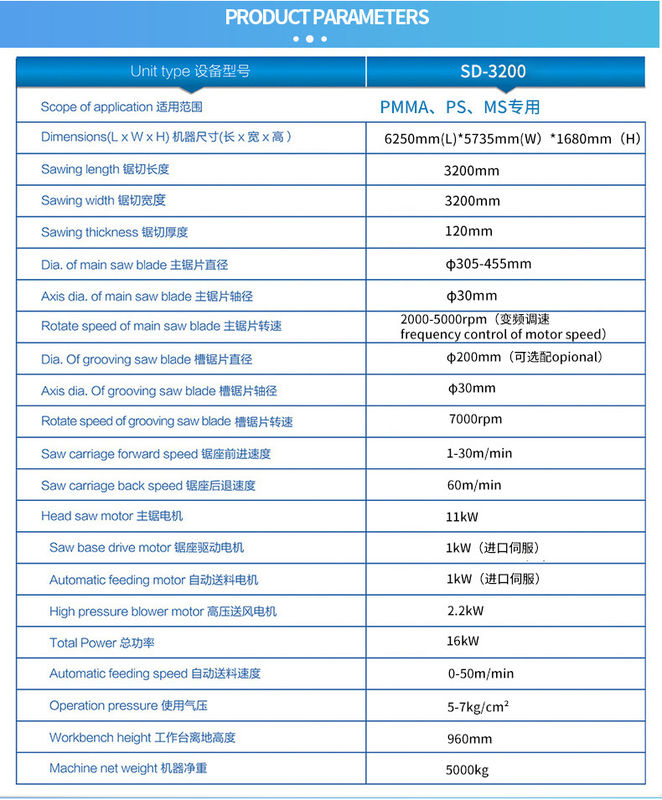 7. आरा सीट का गाइड रेल आयातित ब्रांड को अपनाता है, आरा सीधापन < 0.06 मिमी, उच्च परिशुद्धता और भारी भार के साथ, पैनसोनिक सर्वो नियंत्रण विशेष रूप से PMMA, MS, PS, PLEXIGLASS के लिए उपयोग किया जाता है,एक्रिलिकप्लास्टिक.